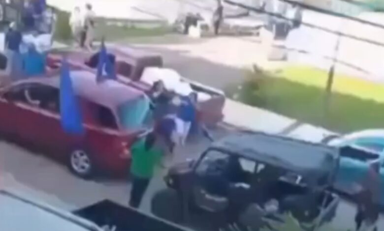 Un video que circula con rabia en redes sociales muestra al menos cuatro personas que ondeaban banderas del Partido Nacional, intercambiando golpes, patadas y empujones en medio de la calle, ante la mirada de transeúntes que grababan atónitos.