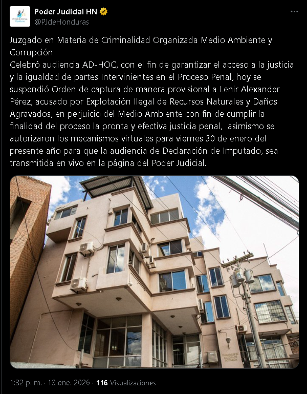 Tegucigalpa. El Juzgado en Materia de Criminalidad Organizada, Medio Ambiente y Corrupción celebró una audiencia AD-HOC en la que se decidió suspender de manera provisional la orden de captura contra Lenir Alexander Pérez. El acusado enfrenta cargos por Explotación Ilegal de Recursos Naturales y Daños Agravados en perjuicio del medio ambiente. Esta medida busca garantizar la igualdad de las partes intervinientes y cumplir con la finalidad de una justicia penal pronta y efectiva en un caso de alto impacto público.