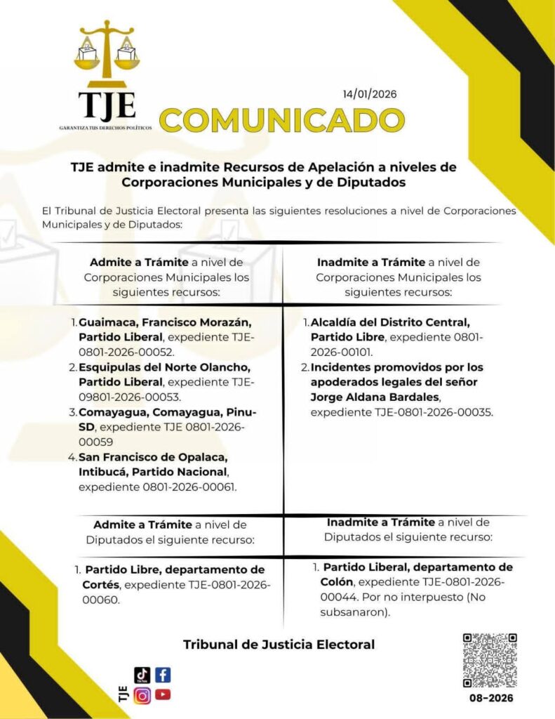 Tegucigalpa. – El Tribunal de Justicia Electoral (TJE) emitió un comunicado detallando las resoluciones sobre diversos recursos de apelación presentados tras el proceso electoral. El organismo informó tanto la admisión como la inadmisión de trámites a nivel de corporaciones municipales y diputaciones en varios departamentos del país.
