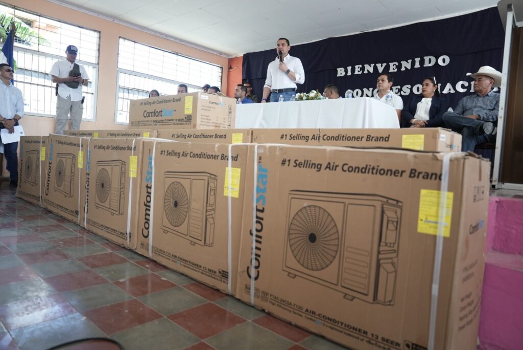 El titular del Congreso precisó que a cada centro le corresponden cinco aparatos y explicó que “vamos a implementar en Valle y Choluteca un programa de climatización en las escuelas; esto no es un lujo, es una necesidad y por eso estamos aquí en La Paz”.