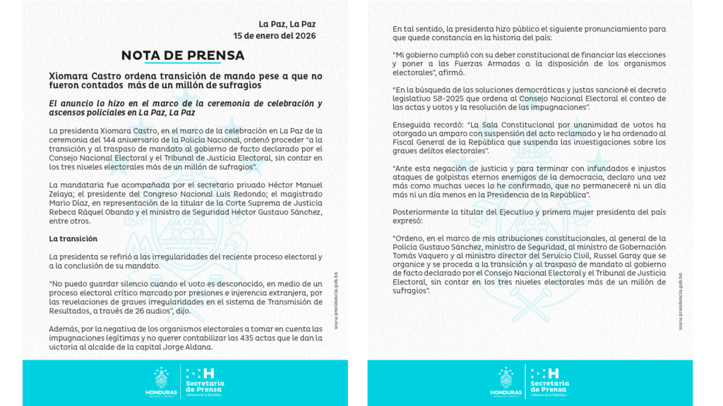 La Paz.- Durante la ceremonia del 144 aniversario de la Policía Nacional en La Paz, la presidenta Xiomara Castro instruyó formalmente el inicio de la transición de mando hacia las nuevas autoridades. Sin embargo, la mandataria lanzó duras críticas al proceso, calificando a la administración entrante como un “gobierno de facto” declarado por los organismos electorales sin haber contabilizado más de un millón de sufragios en los tres niveles electivos.