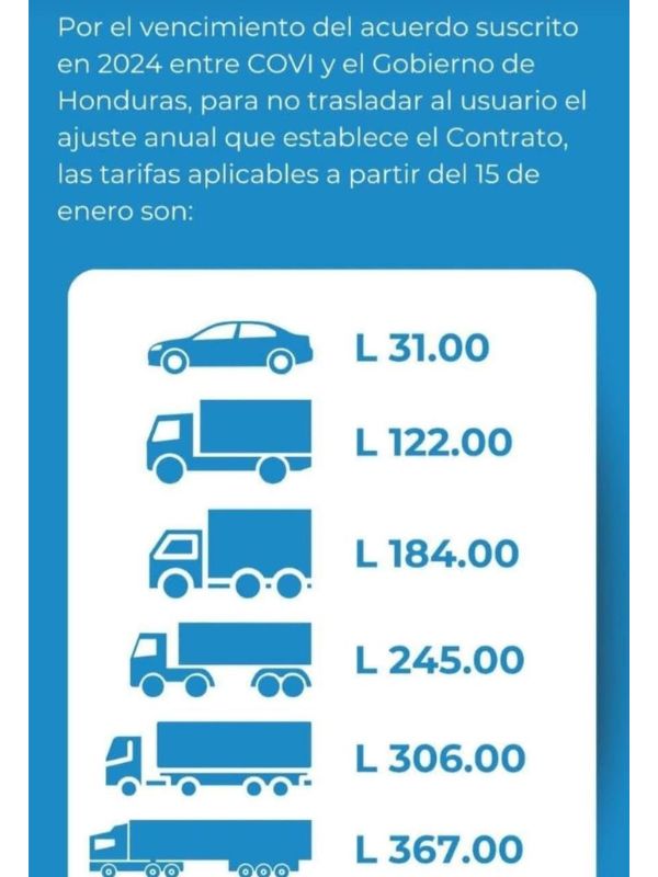 La concesionaria COVI-Honduras ha ratificado que el aumento es imperativo debido al vencimiento del acuerdo que mantenía congeladas las tarifas desde el año 2020 y a una deuda millonaria que el Gobierno actual mantiene con la empresa. Por su parte, los dirigentes del transporte de carga y pasajeros han advertido que, de no llegarse a un acuerdo que posponga o reduzca el impacto del ajuste, no descartan iniciar un paro nacional de labores para paralizar las principales arterias viales del país.